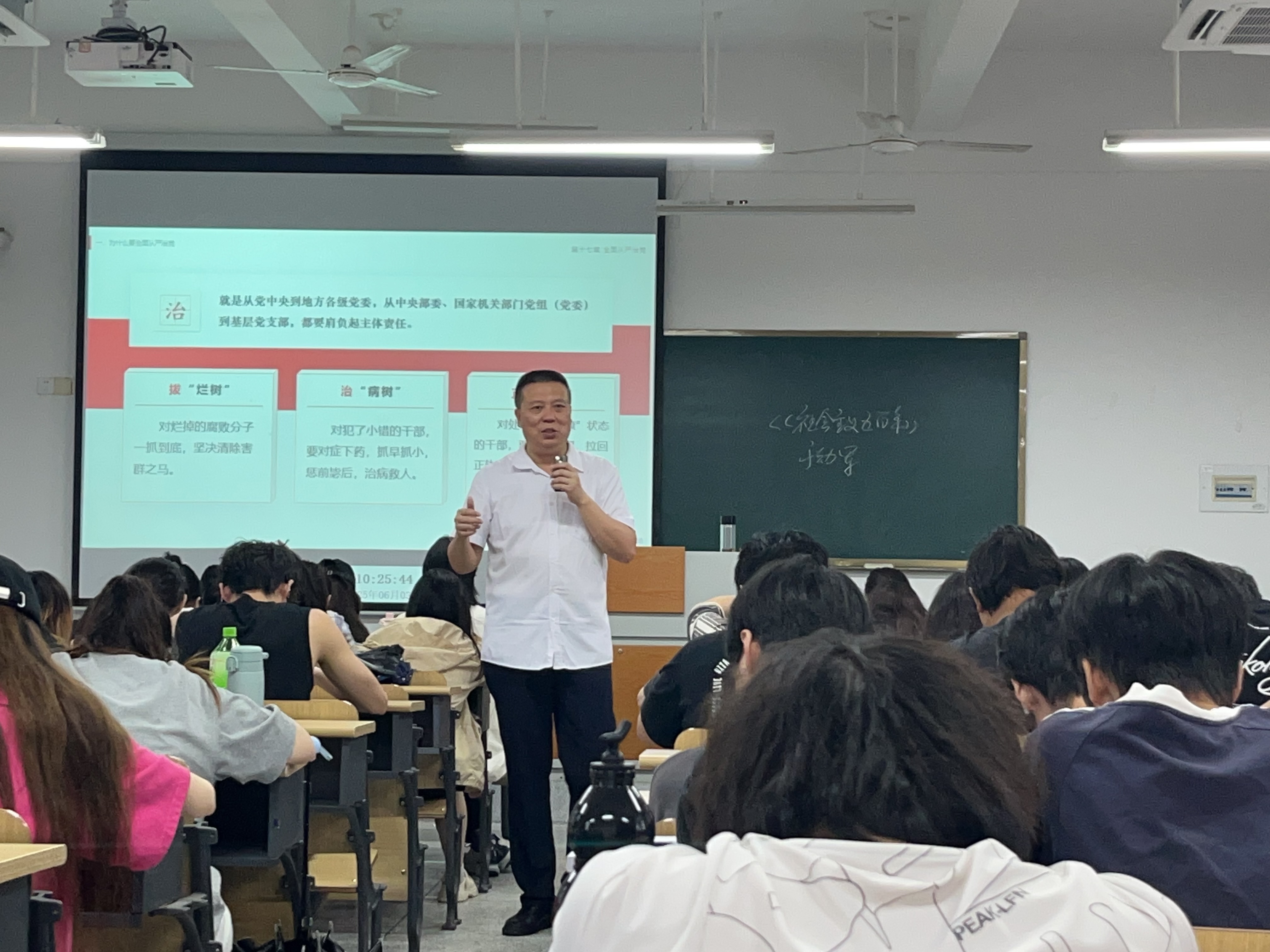 本次课堂聚焦“全面从严治党”专题。郑炳杰老师围绕“为什么要强调全面从严治党”和“什么是全面从严治党”两大核心问题展开教学。他紧密结合党的执政地位、肩负的历史使命以及面临的风险挑战,深刻剖析了全面从严治党的极端重要性和现实紧迫性,并通过设问引发学生深度思考。在阐释“全面从严治党”的内涵时,郑老师创新运用“全面”“从严”“治党”三词拆解法,系统清晰地解读了这一战略部署覆盖党的建设各个领域、贯穿所有环节的系统性要求。课堂上,郑炳杰老师援引典型案例,生动展现了我们党以“自我革命”精神推进全面从严治党的勇气与决心,学生们积极参与,围绕“如何筑牢年轻干部拒腐防变思想防线”等现实议题展开了热烈讨论。