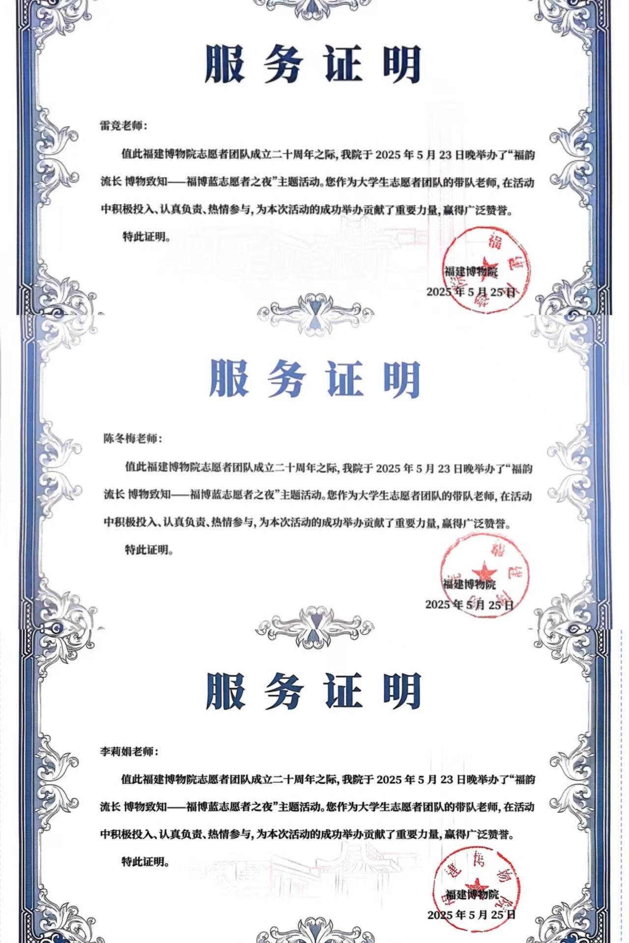 活动落幕后,福建博物院在致谢函中高度评价三位教师的表现,称其“以实际行动践行‘奉献、友爱、互助、进步’的志愿精神,为庆典活动的顺利开展提供了有力支持,展现了高校教师的责任担当与公益情怀”。同时颁发的志愿服务证明,详细记录了三位教师的服务时长与内容,成为其参与公益服务的重要见证。